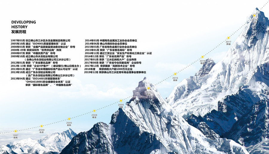 广东永龙铝业有限公司 Guangdong Yonglong Aluminum Co., Ltd 广东永龙铝业有限公司位于佛山市三水区乐平乐群大道10号,公司始建于1997年,是集铝合金型材研发、生产与销售等为一体的综合性大型铝型材企业,公司主导经营“弘盈铝材”“科努克高端铝材”,“斑田系统门窗”“龙美铝材”品牌。雄厚的综合实力和优质的服务,使永龙“弘盈铝材”,“龙美铝材”畅销全国各地,出口到英国、美国、澳大利亚、加拿大、俄罗斯等多个国家。 Guangdong Yonglong Aluminum Co., Ltd. is located at No. 10, Lequn Avenue, Leping, Sanshui District, Foshan City. The company was