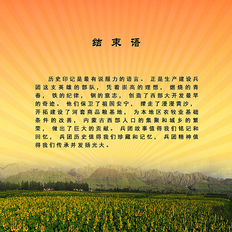 前言 → 兵团简介 → 兵团序幕 → 领导核心 → 机构设置 → 机关团体 → 战天斗地 → 开荒种地 → 畜牧养殖 → 返乡探亲 → 连队生活 → 战马英姿 → 文体活动