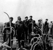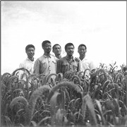 106-杨义林副师长(前左二)陪同黑龙江兵团阎副司令员到四团一连参观丰产高梁(1969) |