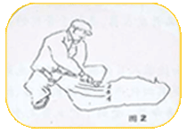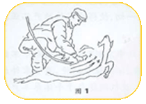第一道工序:剪毛工将羊放倒,腹部朝上,并将羊的右后腿夹在右腿关节中之后,呈下蹲姿势。从羊腹部右侧前后腿之间开剪,依次向左侧剪完腹部毛,剪公羊包皮附近抟时要特别小心需横向推进,母羊乳房后部的毛也应在此时剪掉,为了避免剪掉或剪伤乳头应用左手手指扭在乳头后剪毛。(图1所示) |