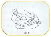 第三道工序:用右膝轻压在羊后腿上部,左手拉住羊左前腿,依次长行程剪去左侧、前腿和左肩的毛。此时要剪过脊椎骨。(图3所示) |