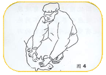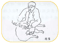 第六道工序:左手将羊头拉向剪毛工右小腿使羊颈右侧皮肤拉紧,剪掉羊颈右侧的毛。(图6所示) |