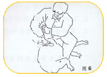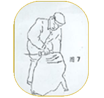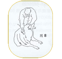 第七道工序: 剪毛工的腿移到羊背部,两腿呈左右夹羊姿势。左手握住羊下颚用力拉起,把羊头按在两膝上。剪羊颈下垂部右侧毛,此后把羊头推倒两腿后,用两腿夹住羊的脖子剪胸部右剪退的毛。(图7所示) |