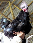 丝毛乌骨鸡(又名泰和鸡、绒毛鸡、丛冠鸡、竹丝鸡):原产于我国江西省泰和县等地,是中国饲养量最大的品种之一,已列入国际标准品种,其外貌具有“十全”特征,即:从冠(又称桑椹冠)、缨头(又称凤头)、绿耳、胡须、丝毛、乌脚、乌爪、乌皮、乌肉、乌骨。成年公鸡1.3—1.5公斤,成年母鸡1.0—1.2公斤。公鸡性成熟日龄150—160天,母鸡性成熟170—180天,年产蛋100枚左右,蛋重40克左右,蛋壳呈浅白色。泰和鸡行动迟缓,成鸡对环境的适应性较强,患病较少;幼雏体小,质弱,抗逆性差,在饲养管理上应予以重视。泰和鸡还具有胆小喜静,生性活泼,群居性强,食性广杂,抱性强等特点。泰和鸡药用价值极高:近代医学认为,泰和鸡有治头痛、胃痛、慢性胃炎、慢性肝炎、风湿性关节炎、哮喘、气管炎、喉炎、脑神经病,心脏病及促进创伤愈合等功效。目前在我国以泰和鸡为原料生产的中成药就有数十种之多,如“乌鸡白凤丸”、 “参茸白风丸”、“乌鸡白凤康妇精”等。此外,泰和鸡因其肉质细嫩,营养丰富,脂肪含量低等优点而成为备受推崇的四季进补佳品。